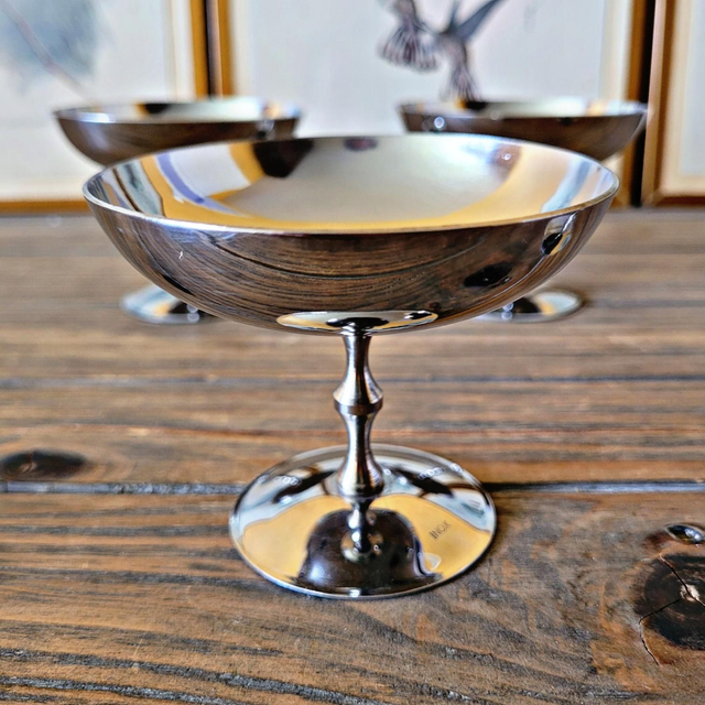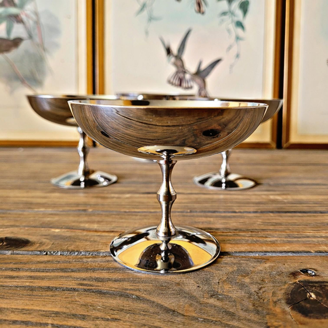 Lot de 6 ou 4 petites coupes ou coupelles à glace (sorbet) vintage en inox. Peuvent être aussi utilisées en verre à cocktail ou pour un autre dessert (salade de fruits…). Jambe joliment travaillée.