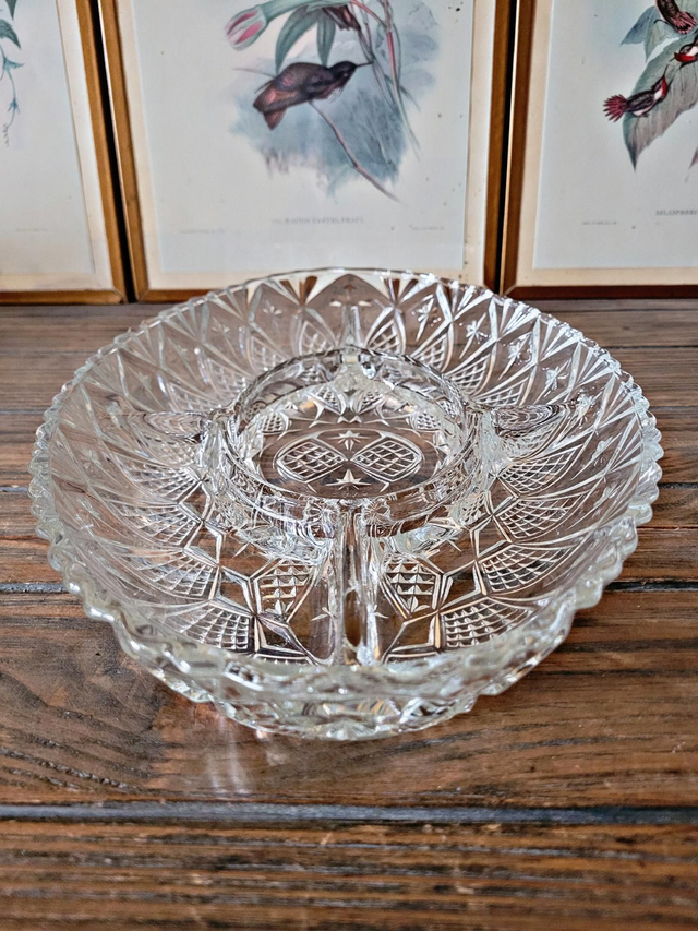 Plat apéritif vintage verre ciselé, serviteur 5 compartiments
