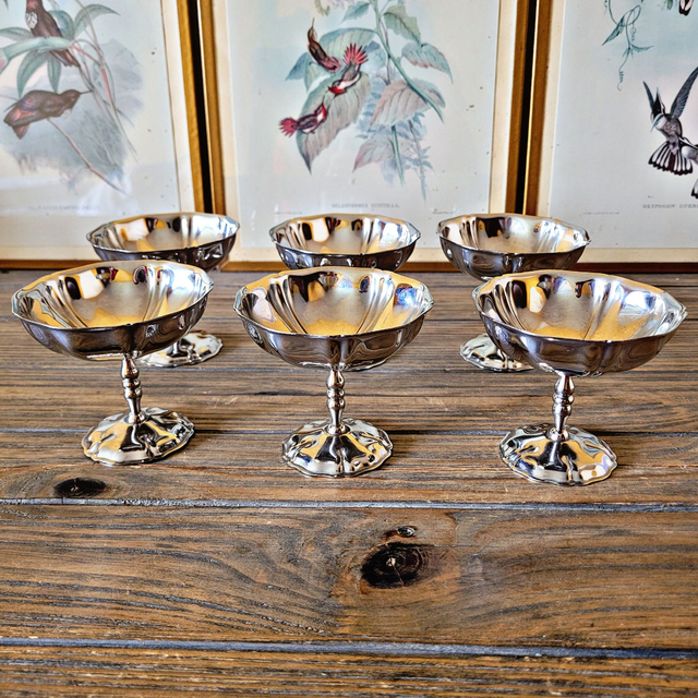 Lot de 12 coupes ou coupelles à glace (sorbet) vintage en inox. Peuvent être aussi utilisées en verre à cocktail ou pour un autre dessert (salade de fruits…).