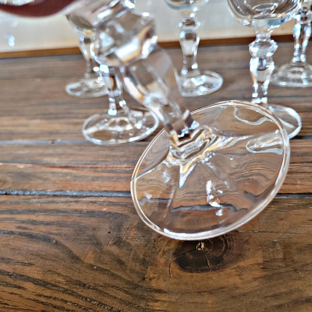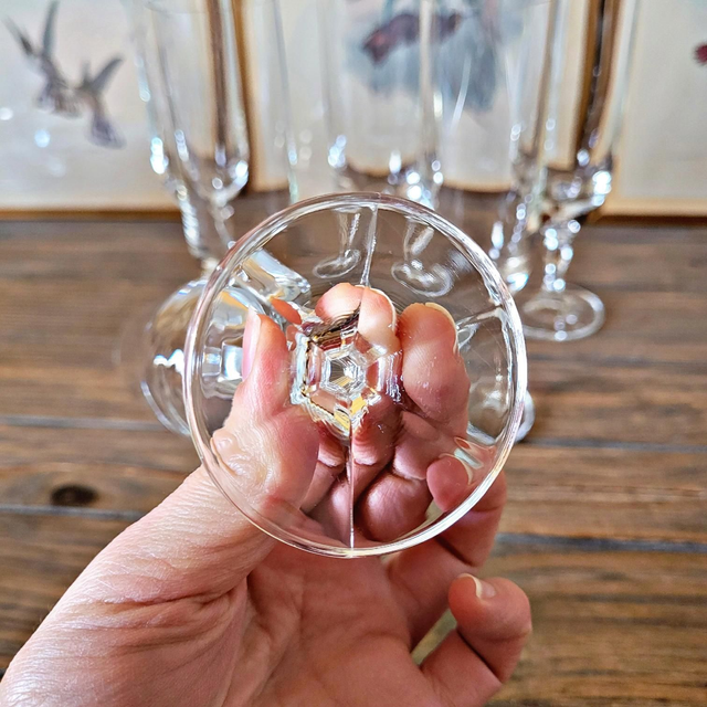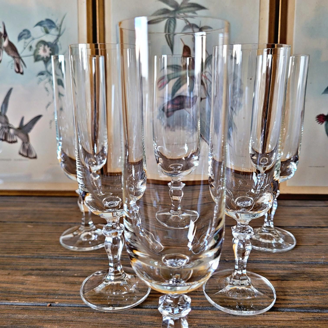Ces flûtes ont été utilisées, mais restent en très bel état, avec seulement de légères traces d’usage, discrètes. L’une d’entre elles présente un petit défaut de fabrication (bulle dans le cristal), détail authentique qui rappelle le travail du verre.